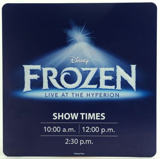 (Disney California Adventure, c. 2000's). A park used prop sign for Disney California Adventure "Frozen" shows live at the Hyperion theater. The sign is in good condition with normal wear from age and park use.