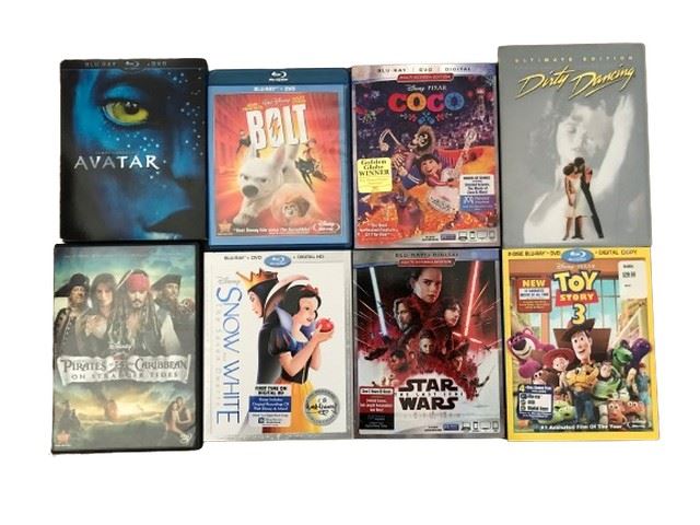 A collection of new Disney DVDs from the following movies: Avatar, Toy Story 3, Star Wars the Last Jedi, Pirates of the Caribbean on Stranger Tides, Coco, Bolt (starring John Travolta and Miley Cyrus), Snow White and the seven dwarfs animated DVD from the signature Walt Disney collection and the ultimate edition of Dirty Dancing.