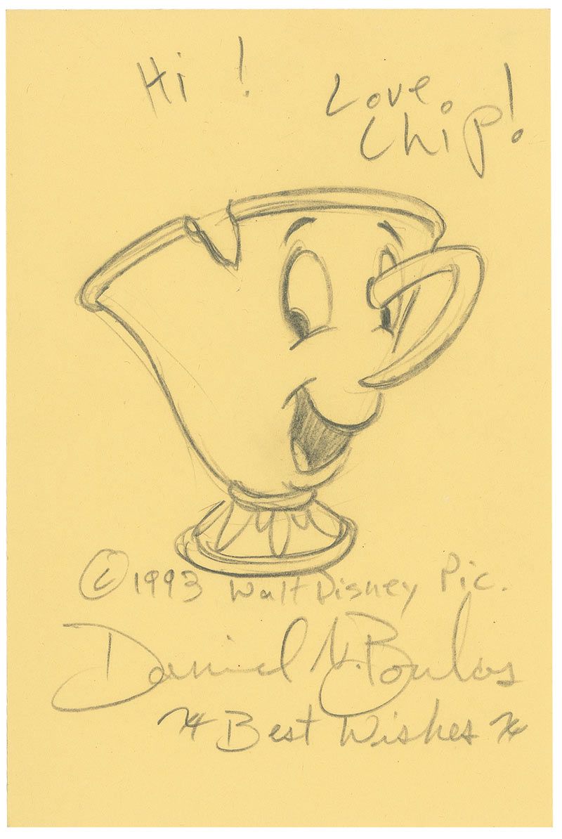 Original pencil sketch of Chip on a yellow 4 x 6 sheet, signed in pencil, “Hi! Love Chip! © 1993 Walt Disney Pic., Daniel N. Boulos, Best Wishes.” In fine condition.