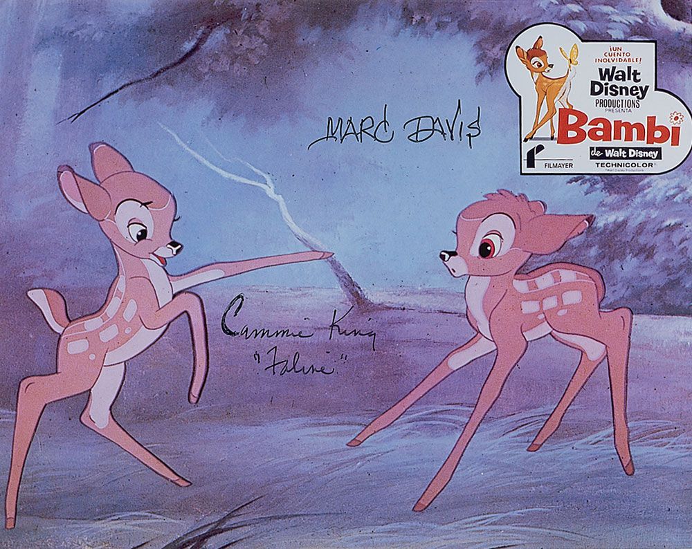Color glossy 10 x 8 photo of a scene from Bambi, signed in black felt tip, “Marc Davis” and “Cammie King, ‘Faline.’” In fine condition, with King rewriting the first letter of her name after a failed initial attempt.