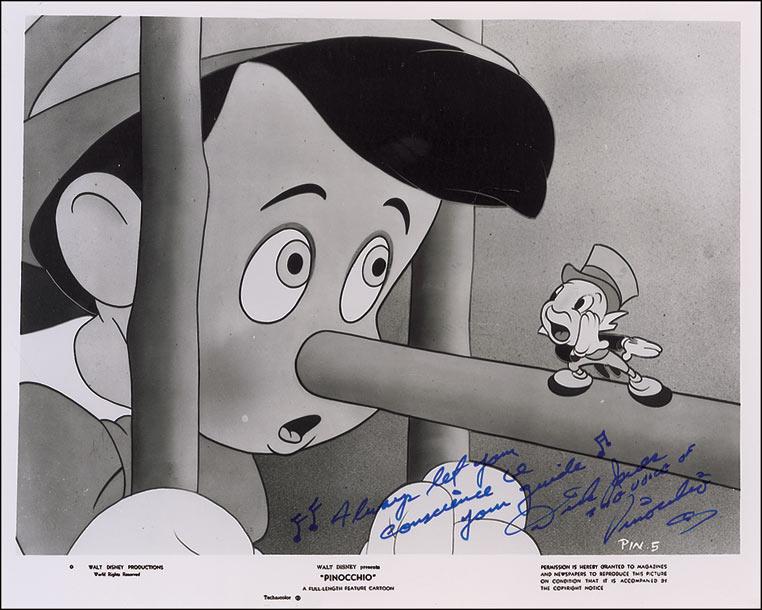 Glossy 8 x 10 Pinocchio promotional photo, signed in blue felt tip, “Always let your conscience be your guide, Dick Jones, the voice of ‘Pinocchio,’” adding with drawings of three little music notes. In fine condition.
