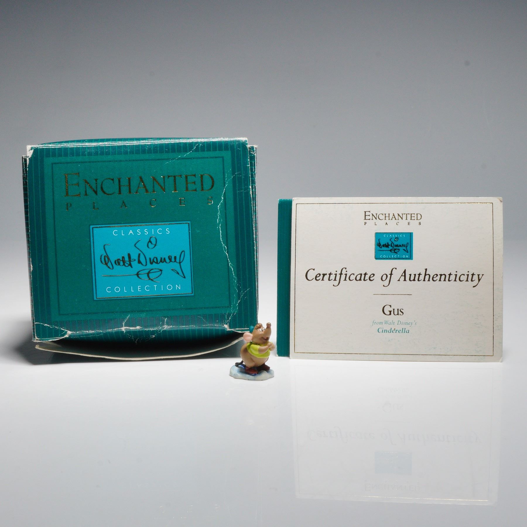 From the Walt Disney Classics Collection Enchanted Places series, this miniature figurine depicts Gus, one of Cinderella's loyal mouse companions, rendered in fine detail and hand-painted. The figure is marked on the base and comes complete with its original box and Certificate of Authenticity.