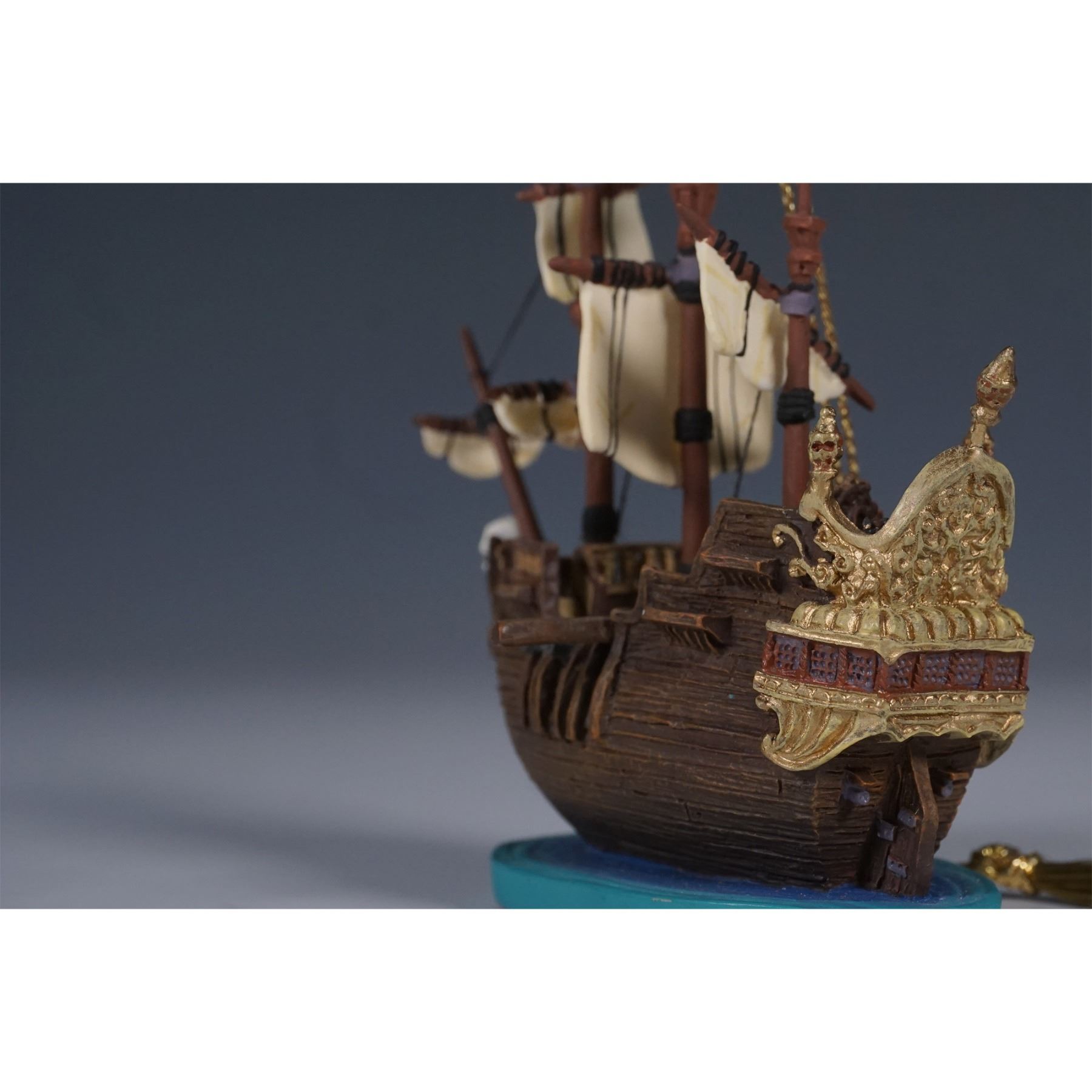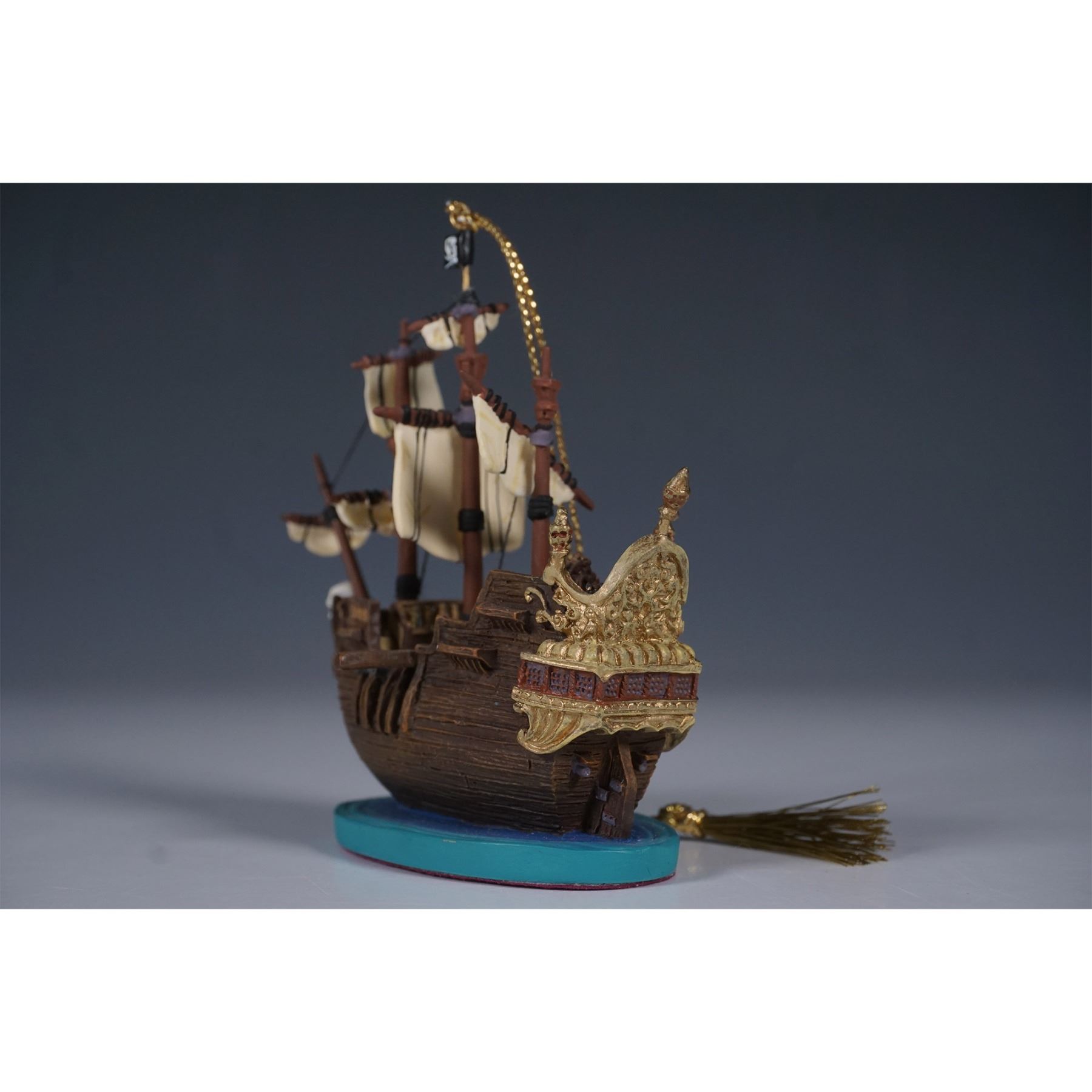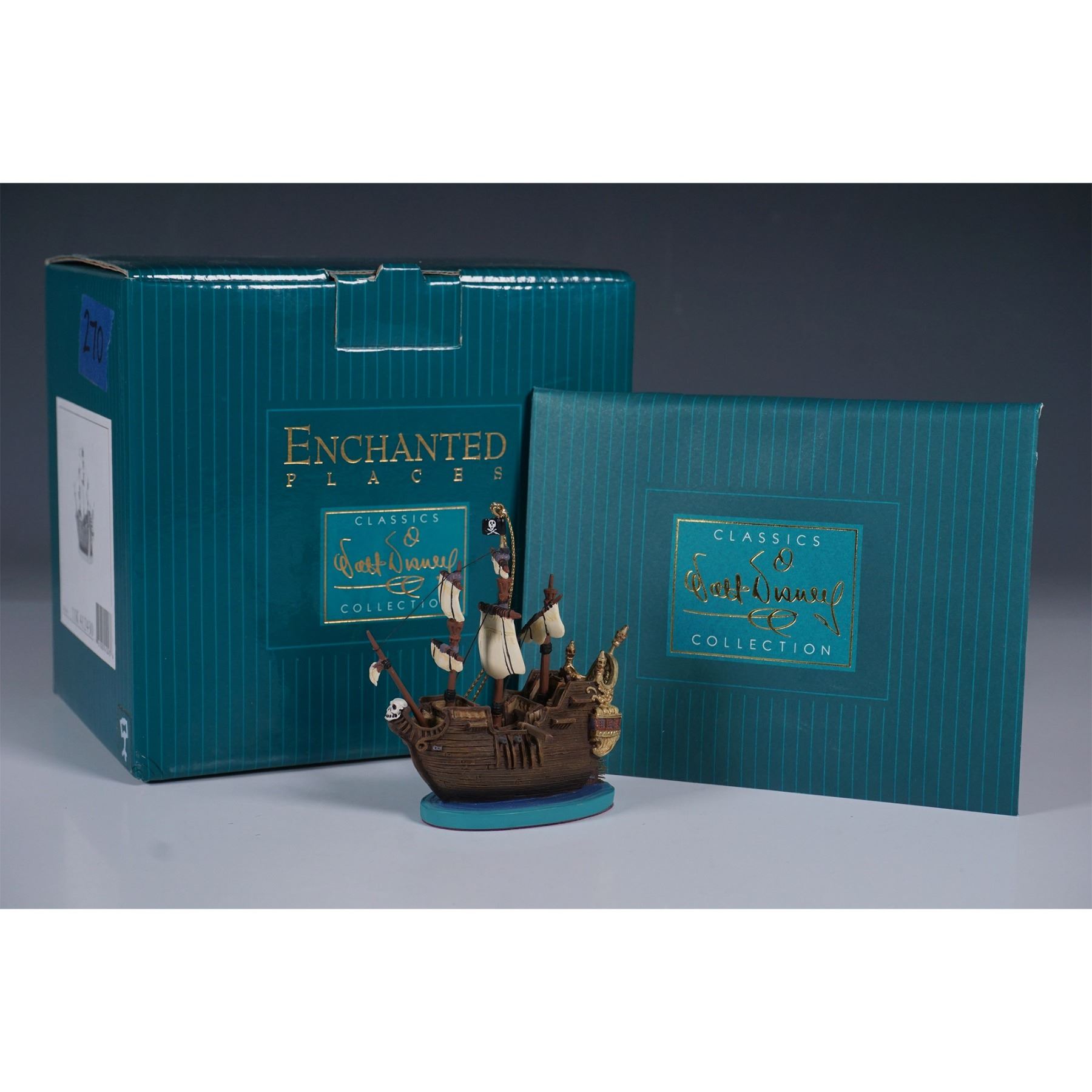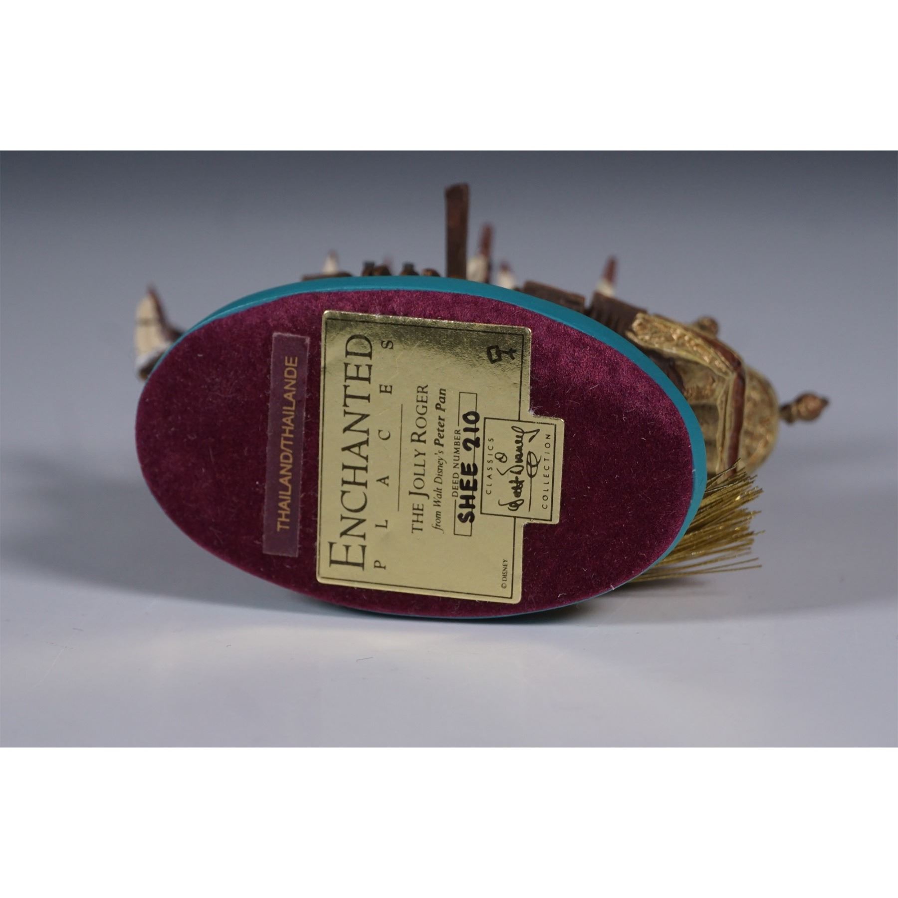 A finely detailed Disney Enchanted Places ornament featuring the Jolly Roger, the infamous pirate ship from Walt Disney's Peter Pan. This intricately crafted piece showcases textured wood-like surfaces, billowing sails, and pirate-themed accents, including a skull-and-crossbones flag. Designed as part of the Walt Disney Classics Collection, this figurine includes its original box and Certificate of Authenticity. The underside is marked with the Enchanted Places logo and edition details, confirming its authenticity.