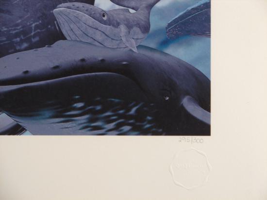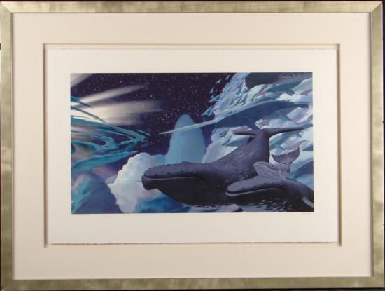 "The Walt Disney Studios has created this character image using the fine art printing process of color reproduction known as giclée. In this process Pacific Editions took computer based digital files created by Disney artists based on material from the film and printed them by spraying millions of pixel sized drop of ink per second onto premium quality, acid free paper or canvas with an enhanced printer, specially modified for fine art reproduction." This lovely image of a family of whales is a stunning piece of animation art!
