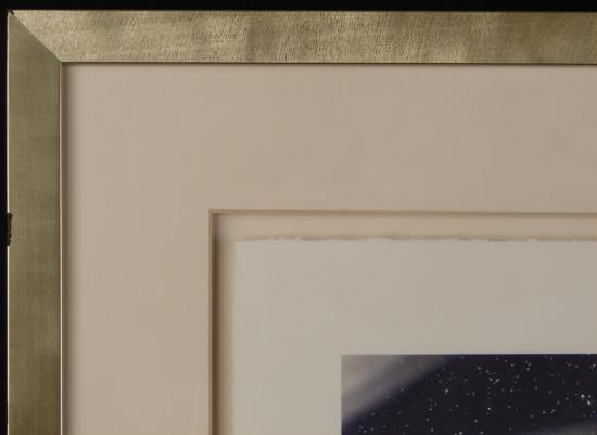 This animation print portrays an undersea scene from "Fantasia 2000." Walt Disney Studios has created this character image using the fine art printing process of color reproduction known as "Giclée." The print is elegantly framed in a brushed silver-gilt frame and the paper is "floating" inside the matte, which enhances the light, fantasy element of the picture. Title: "Taking Flights" Medium: Giclée print on paper Published by: Walt Disney Art Classics Date of Publication: 2000 Numbered 295 of 300 Page size: 15½ by 23 inches Frame size: 23 by 30½ inches Condition: Excellent, some light finish chipping on frame edges Publisher's Certificate of Authenticity on verso