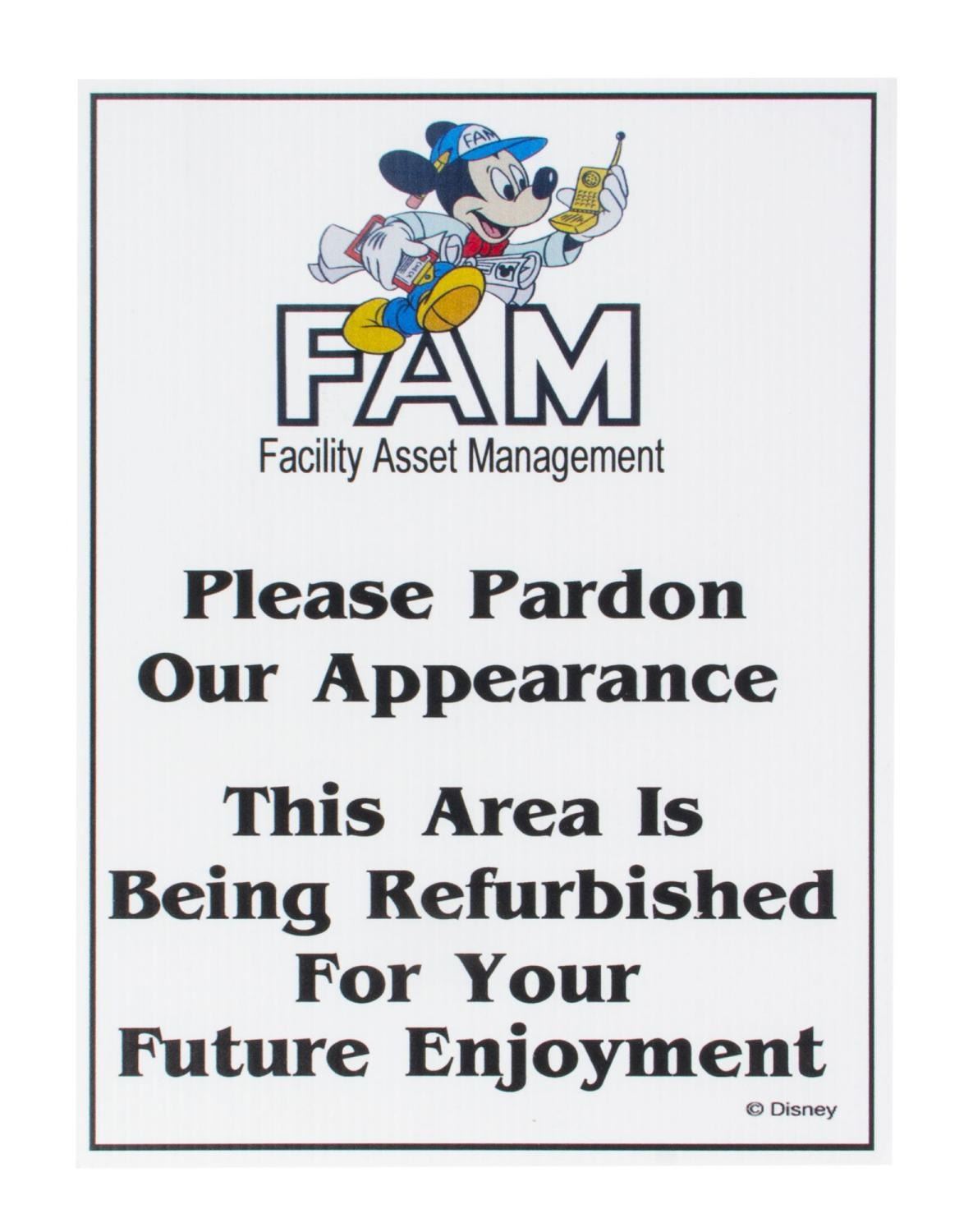 (Disneyland, c.2000s) A sign used by Disney Facility Asset Management to indicate an area closure due to refurbishment. Facility Asset Management coordinates building and refurbishment across Disney Parks and Experiences assets and properties. Printed on lightweight corrugated plastic, the sign features the Engineer Mickey FAM logo and apologizes for unsightly surroundings. Measuring 18"x13.25", the piece is in very good condition with minor surface wear from use.