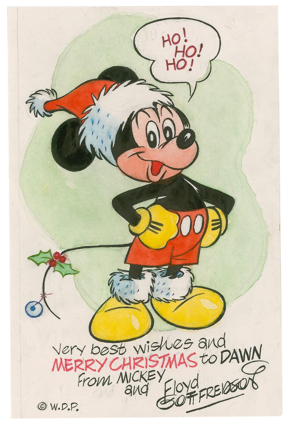 Original vintage signed and inscribed ink, felt tip, and watercolor sketch of Mickey Mouse in a Santa hat on an off-white 6 x 9 sheet, signed and inscribed at the bottom, “Very best wishes and Merry Christmas to Dawn from Mickey and Floyd Gottfredson.” In fine condition, with some scattered mild rippling. An eye-catching and appealing full length example from the Disney apprentice who drew Mickey Mouse for over 45 years.