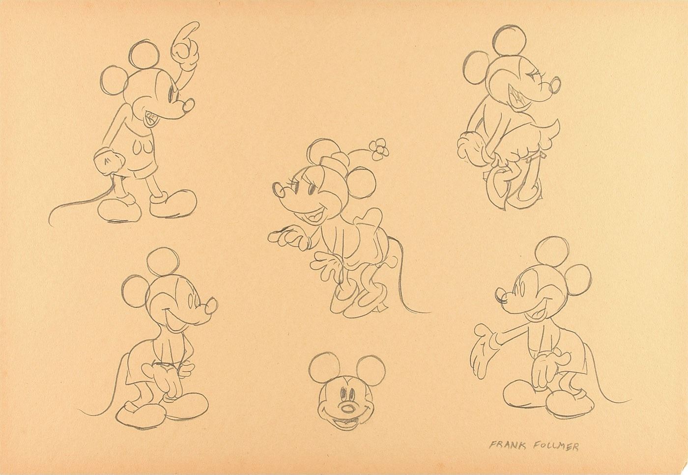 Wonderful original pencil concept sketches of Mickey Mouse and Minnie Mouse on an off-white 18 x 12 sheet, signed in the lower right corner in pencil by Frank Follmer. The sketches show each classic Disney character in multiple poses. In fine condition, with uniform toning.