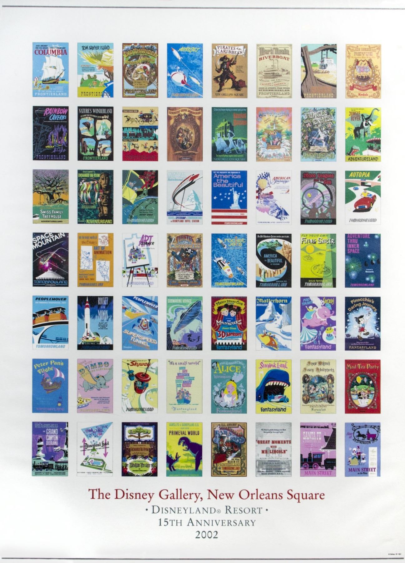 (Disneyland, 2002) A large canvas banner used during the 15th anniversary events for Disneyland's "Disney Gallery". The banner features 54 images of the park's iconic attraction posters and notes the anniversary event along the bottom-edge. The banner measures 48"x36" and is in very good condition with minor wear.