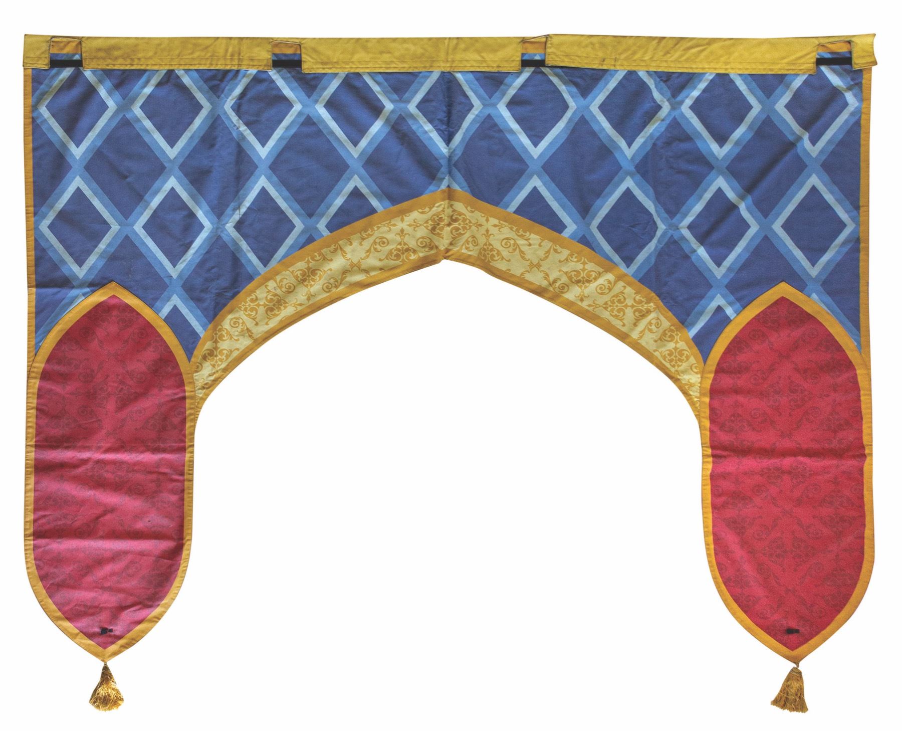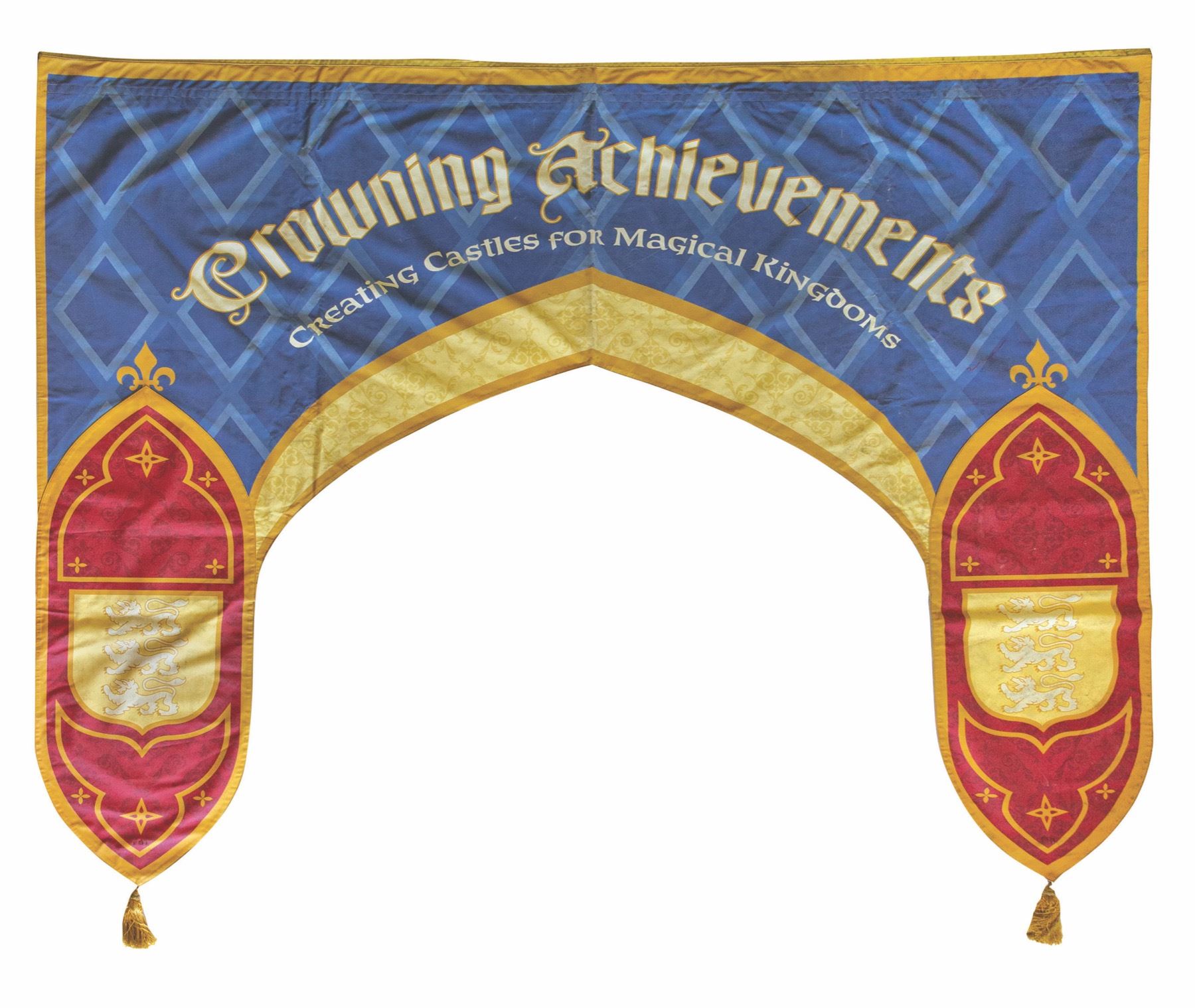 (Disneyland, 2012) A fantastic entry banner from a Disney Gallery exhibit titled "Crowning Achievements - Creating Castles for Magical Kingdoms." This exhibit showcased the stunning works by Disney artists such as Herb Ryman, Eyvind Earle, Frank Armitage, and many more, all featuring the various Disney parks castles. The banner hung over the entryway, announcing this exciting exhibit to park guests. Measuring 92"x96" with tassels included, this banner is in good condition with some wear throughout from use.