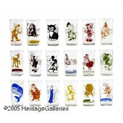<B>Disney Glassware Group (Walt Disney Productions, 1938).</B></I> An impressive assemblage of vintage Disney tumblers. Each stands nearly 5" tall, and all are in Excellent condition with little to no wear. The characters pictured include: Figaro the cat, Ferdinand the bull, Ferdinand the calf, Ferdinand's Mama, Cleo the Goldfish, Pinocchio, Jiminy Cricket, Mickey Mouse, Gepetto, Lampwick, La Senorita, Stromboli, the Coachman, the Matador, the Blue Fairy, Gideon, Monstro the Whale, and the Bee. Drink up in style with the Disney menagerie! 18 Items
