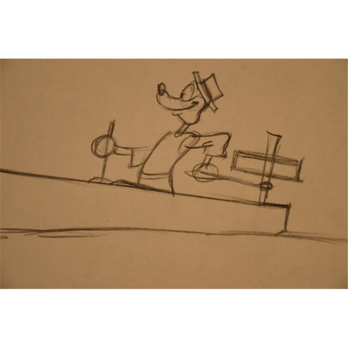 This is an original Production Drawing from the 1939 Disney film titled Goofy and Wilbur. This cartoon features Goofy out for a day of fishing with his trusty grasshopper friend Wilbur. Here Goofy is shown in his boat wearing a Panama hat. * Medium: Black pencil on animator's paperSheet size: 10 x 12 inchesDetails: Numbers, lower rightCondition: Excellent