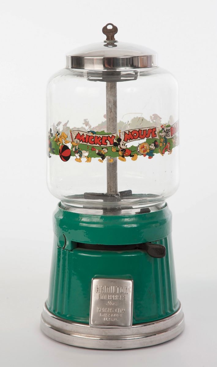 (Hamilton, 1938) Amazing and rare vintage gumball machine manufactured by Hamilton. This coin-operated vendor was manufactured in 1938-39 and is all original, including the decal that runs around the entire glass containment globe. The decal is intact with minimal wear. The machine has a green porcelain/enamel body with the original silver metal chute lid embossed with the Hamilton manufacturer’s mark. The machine measures 15" tall and is in fine condition.
