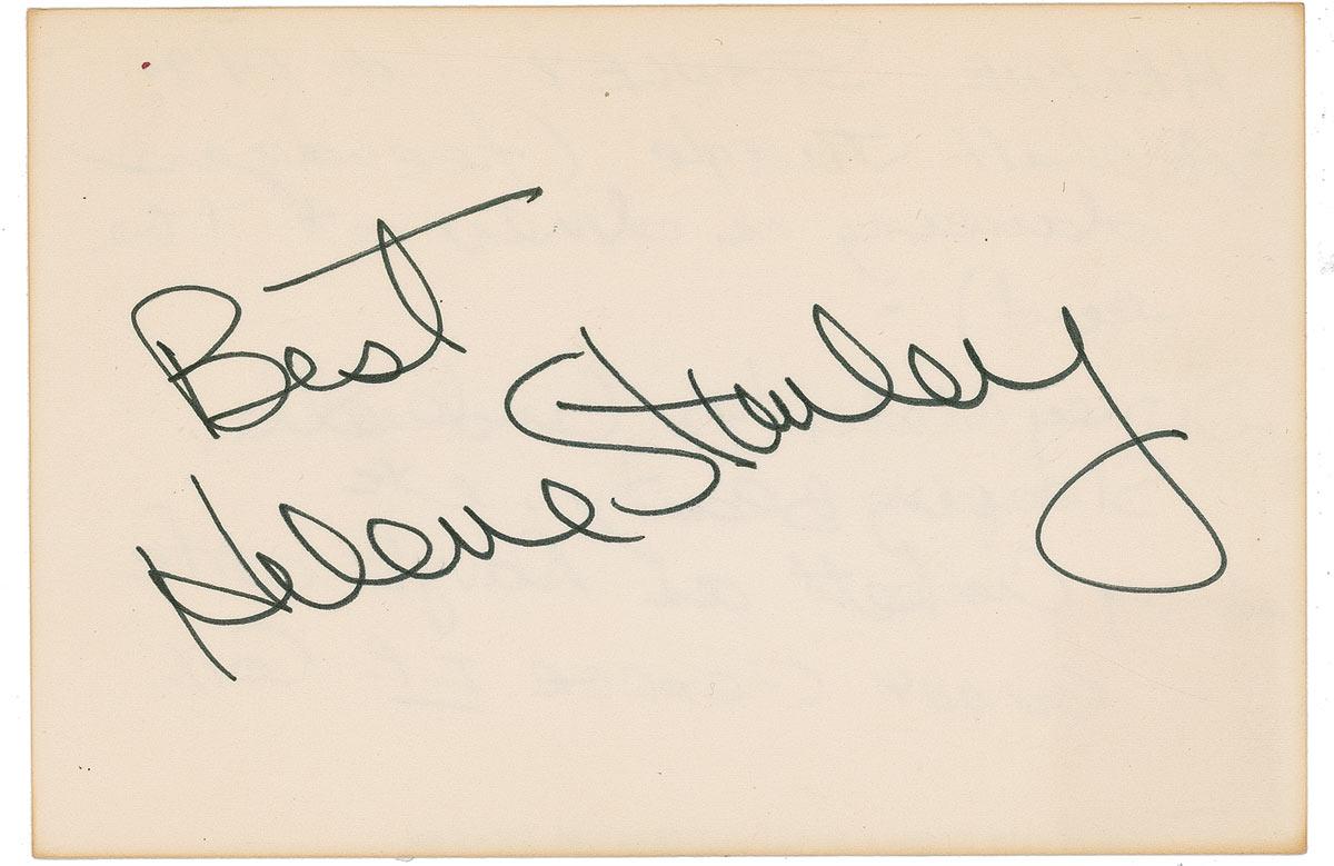 Disney model for Sleeping Beauty, Cinderella, and the wife in 101 Dalmatians. She also appeared in the Davy Crockett programs as his wife, Polly. Felt tip signature, “Best Helene Stanley,” on an off-white 6 x 4 card. In fine condition. Originally acquired from the Buddy George Marshall in-person Hollywood collection.
