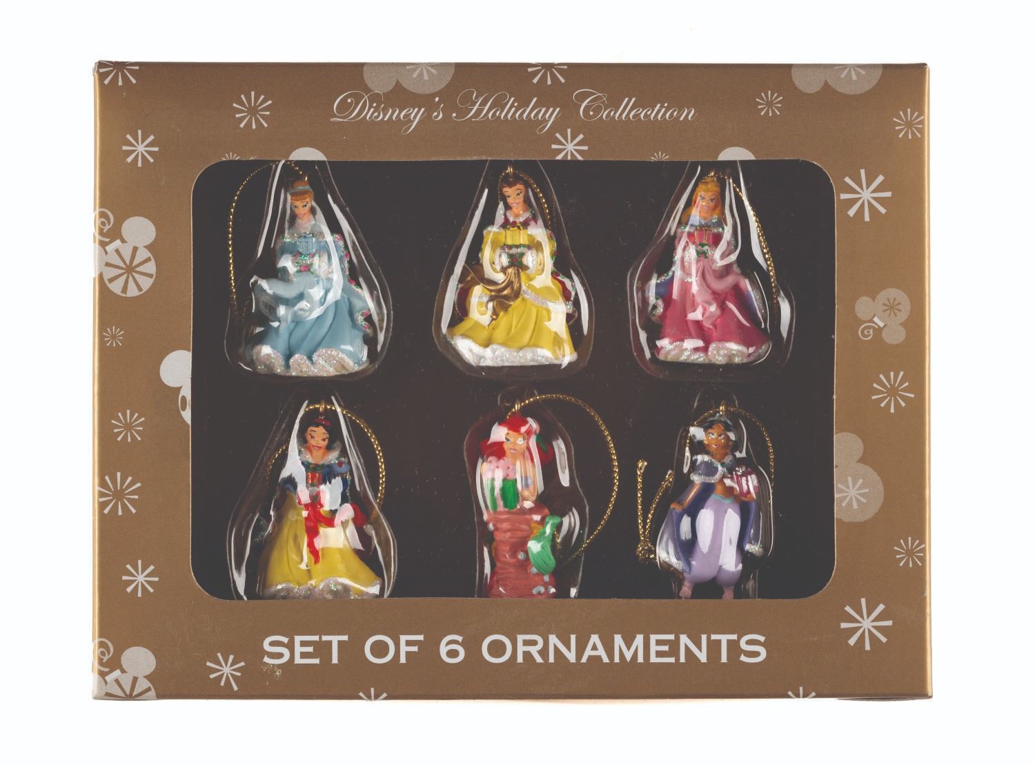 (Disney, 1990s) A boxed set of six mini-ornaments of Disney princesses dressed for the holidays and wrapping presents. Included are Cinderella, Belle, Aurora, Snow White, Ariel, and Jasmine. Each measuring up to 1.5” tall, the resin ornaments are in fine condition sealed in their original box.