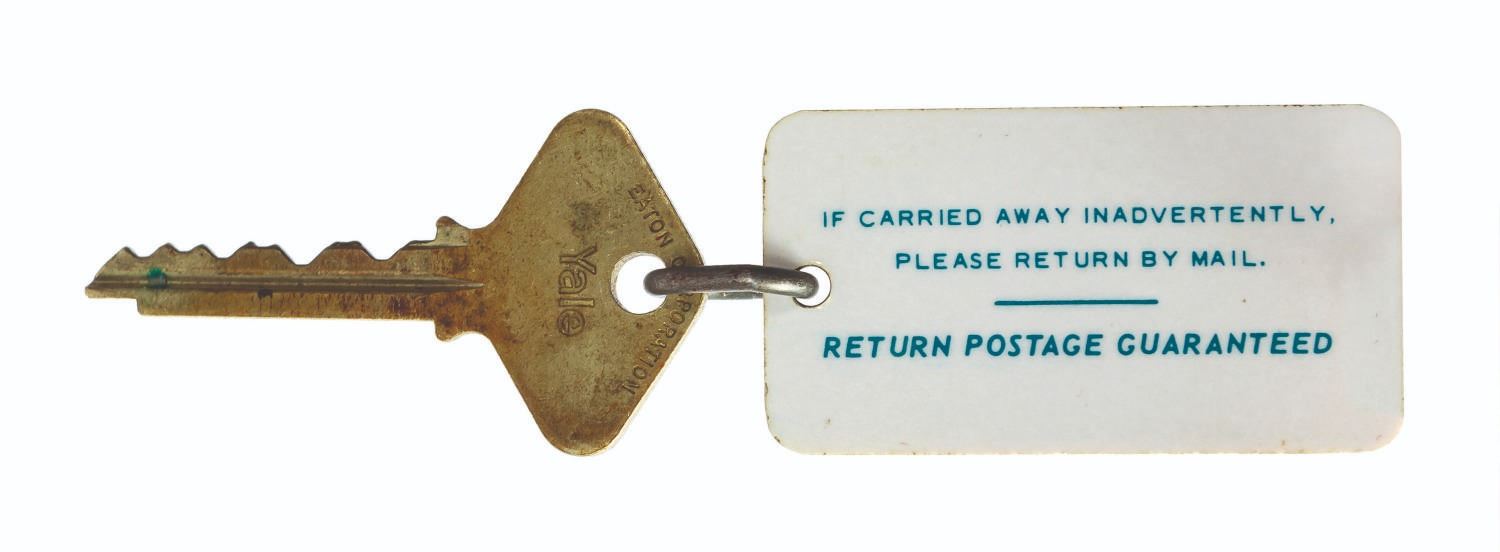 (Disneyland Hotel, c.1970s) A vintage room key and keychain from the Disneyland Hotel. The metal key is etched with room number "2151" and the plastic keychain features the Disneyland Hotel Towers text logo on one side, and a message about returning the key via mail if accidentally carried away on the other. The keychain measures 1.5"x2.5" and the key is 2.5" long. Both are in good condition, with the keychain exhibiting some edge and surface wear and the key exhibiting patina and oxidation staining overall.