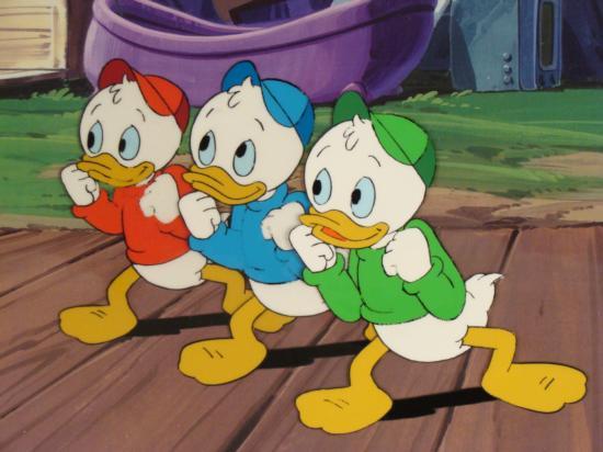 Walt Disney's DuckTales was the first daily animated cartoon show to air weekdays on the Disney Afternoon. DuckTales debuted in 1988. The 1988 - 1989 season consisted of 65 episodes. The next season (1989 - 1990) included an additional 35 episodes, totaling 100. DuckTales is an extremely unique and original cartoon. Episodes such as "Sweet Duck of Youth," "Dr Jekyll and Mr. McDuck," "The Golden Fleecing" and many more play off of legends, literature, and actual historic events. Disney's DuckTales also uses clever "duck" names for characters, as well as creatively used puns to add life to this excellent show. In this cel, it seems that Huey, Dewey, Louie are ready for a fight. Production cel: A hand-painted animation cel that was actually used to create one frame of an animated scene that appeared in a cartoon. Original Production Cel Art with Background Copy Overall Size of the Cel: 10 1/2 × 12 1/2" Overall Size of Background Copy: 10" x 14" © Disney Excellent Condition Traditional animation is a multi-step process which includes various types of art techniques. Drawings are a key part of the process, in which the animator creates the design and movement of the characters. Drawings are then transferred onto acetate cels (by hand-inking and/or photo copying) to create a production cel, which is then hand-painted on the back side, using paint colors chosen and approved by the creators of the series. The background and cel are ready to trimmed, matted, and framed. The animator's notations are shown at the top and bottom of the background and the bottom of the cels. This cel has multi-layers; first is Louie, then Dewey, and finally Huey. The Disney stamp is shown at the top of the background.