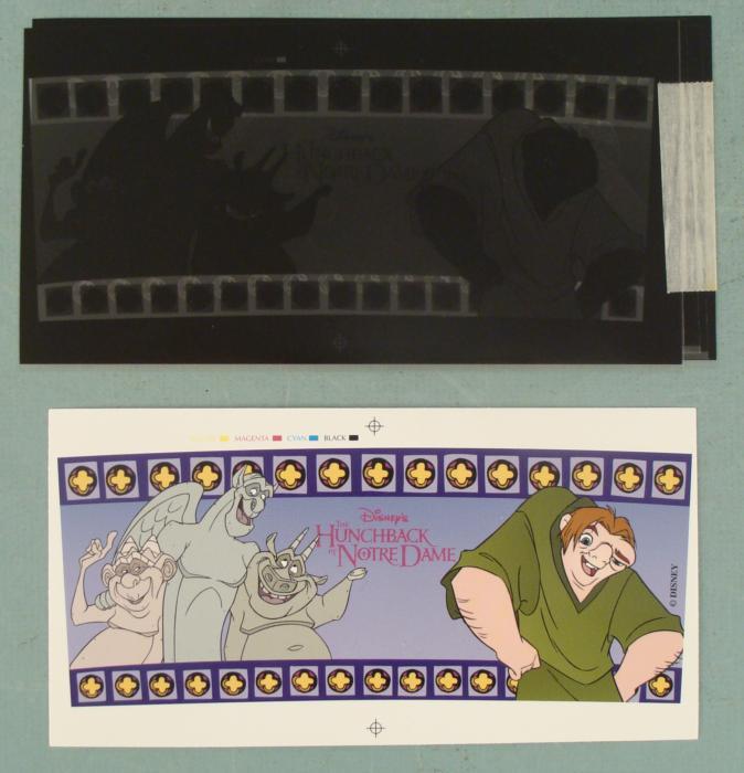 Featured here is a set of original press proof artwork plus negatives used in the production of plastic mugs from "The Hunchback of Notre Dame." It includes four different negative images, and one full color image. The negatives are taped together at the side. The mugs that were made were 3 1/2 inches tall, and these proofs are full size, and in mint condition. The artwork was derived from the private collection of the now former National Director of Disney.