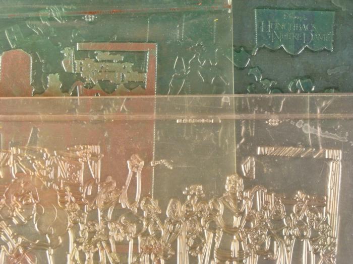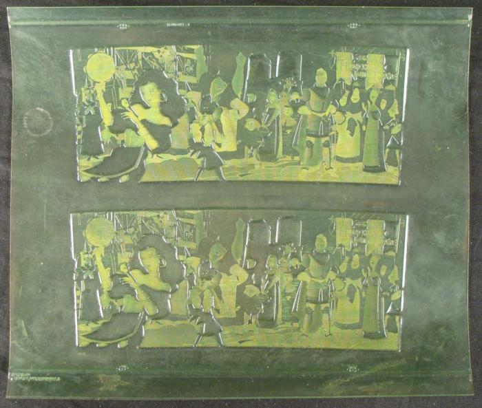 This mug comes with its rarely seen set of printing plates that were actually used in producing the transfer image on the mugs. They are made of translucent rubber, 8 1/2 x 9 1/2 inches, and each of the six was used in processing a different color. The mug is plastic, 3 1/2 inches tall, and was made by Stor in Brazil. It is in mint condition.