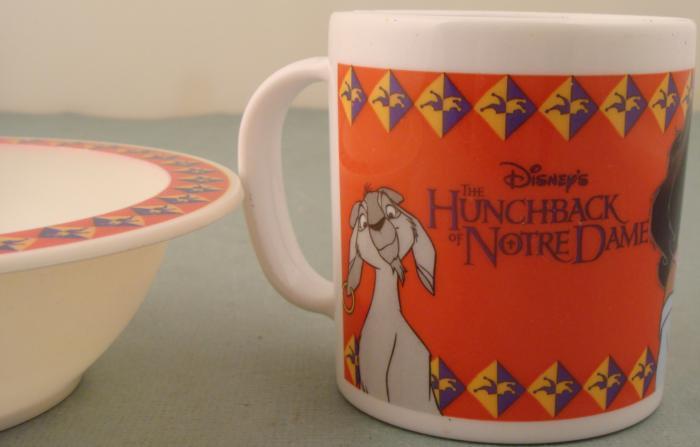 This is a 3 1/2 inch tall plastic mug and 7 inch plastic bowl from the animated story "The Hunchback of Notre Dame." The
