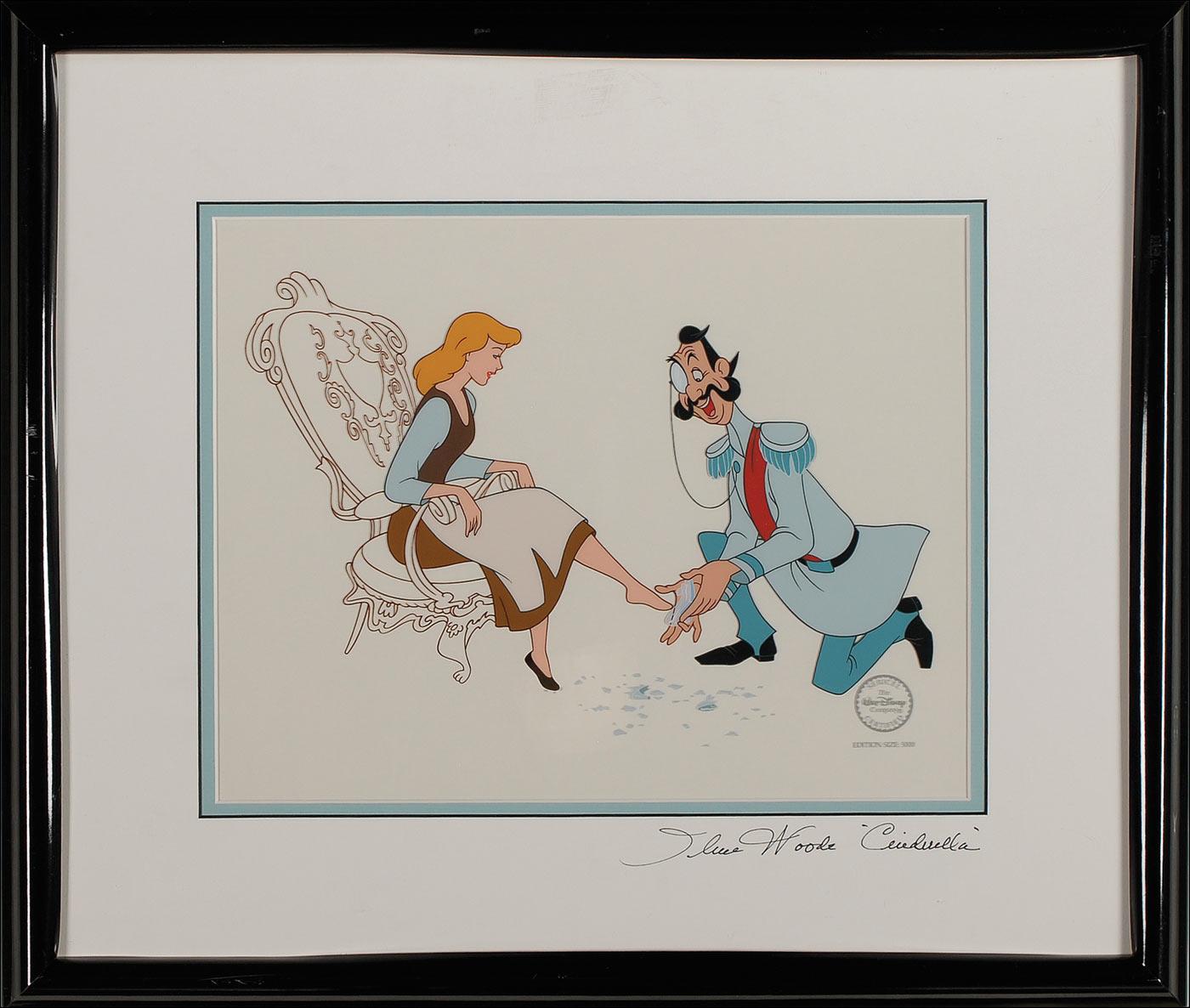 Limited edition color sericel from Cinderella, 12.75 x 10, entitled ‘A Perfect Fit,’ showing Cinderella trying on the glass slipper, and double matted to an overall size of 18.5 x 15.5, signed on the mat in black felt tip, “Ilene Woods ‘Cinderella.’” Framed to an overall size of 20.5 x 17.75. In fine condition.