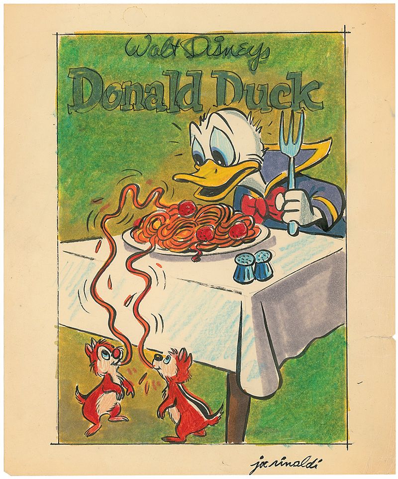 Original ink, watercolor, and colored pencil artwork of Donald Duck ready to eat a plate of spaghetti on a 10 x 12 off-white sheet, signed in the lower border in black ink. In very good condition, with scattered creases, a light overall shade of toning, and a few tears to the borders that could be matted out.