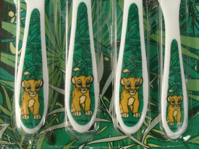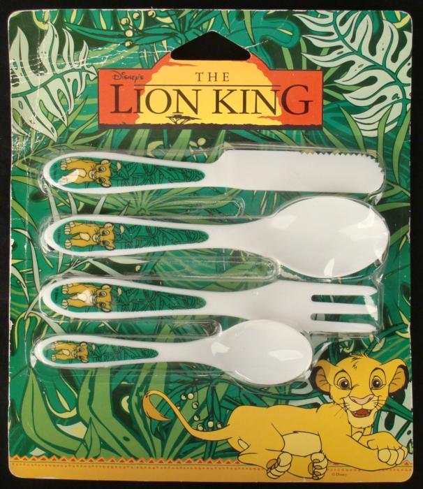This is a Lion King set of plastic dining utensils. It includes a knife, fork, and two sizes of spoons, from 6 to 7 inches long, all in the original packaging. These were made by Stor in Brazil, so the text is in Spanish. The blister pack has a few slight creases and cracks, but otherwise this set is in mint condition.