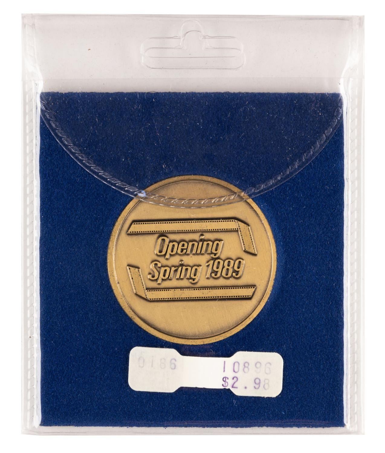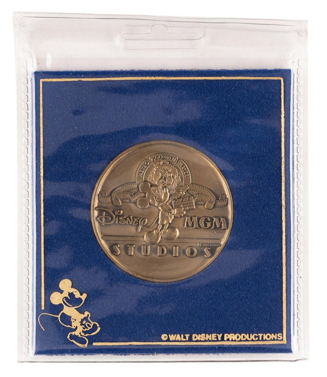 (Disney-MGM, 1989) A collectible coin celebrating the upcoming opening of the Disney-MGM Studios theme park in the Spring of 1989. Measuring 1.75" in diameter, the bronze coin is in fine condition sealed within its original 3.75" x 3.25" plastic sleeve.