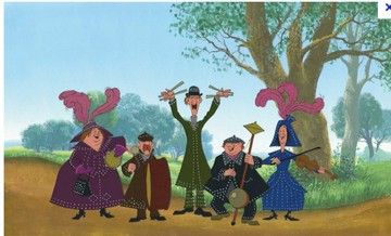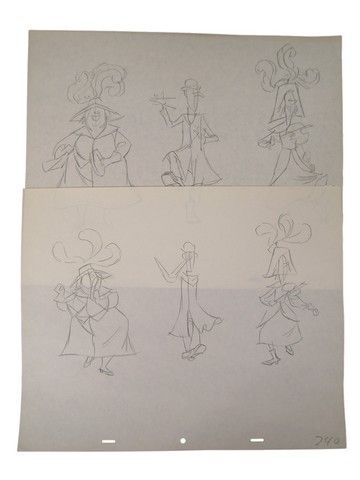 It is hard to find any movie as beloved as Disney's "Mary Poppins". One of Walt's last own personal triumphs, it was, like Disney itself, simply magical. Everything worked. And it still holds up today as fresh and delightful as it was almost fifty years ago! No other film before or since has mixed live auction and animation so seamlessly. Perhaps one of the most popular of the animation characters is the Pearly Band. This is an amazing set of original production pencil drawings from the Mary Poppins Disney animator's of three of those iconic musicians. This set of two character concepts shows the progression from a rough idea to a more detailed character study of the three band members, the "Violin Player", "Mr. Bones", and the "Tambourine Player". They are drawn on oversized registration keyed animation paper, with the numbers "240" and "264" written by the animator's on the lower right hand corner. The paper shows some signs of patina (it's almost fifty years old, after all!). (Both animation drawings are 15.5"x12.5").