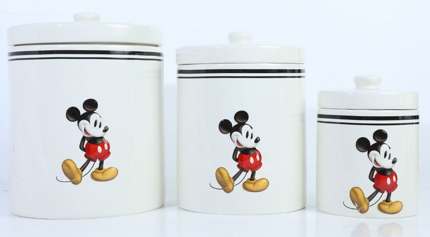 (Disney, c. 2000's). A rare set of three Disney Mickey Mouse canisters of varying sizes. A classic Mickey Mouse poses on each canisters in his icon red shorts and golden shoes. The largest canister measures 8.5" tall, the medium canister is 7.5" and smallest is 5.5". The canisters are in good condition with normal wear from age and minimal handling. Item comes with a Grand Circle Tour Auctions COA.