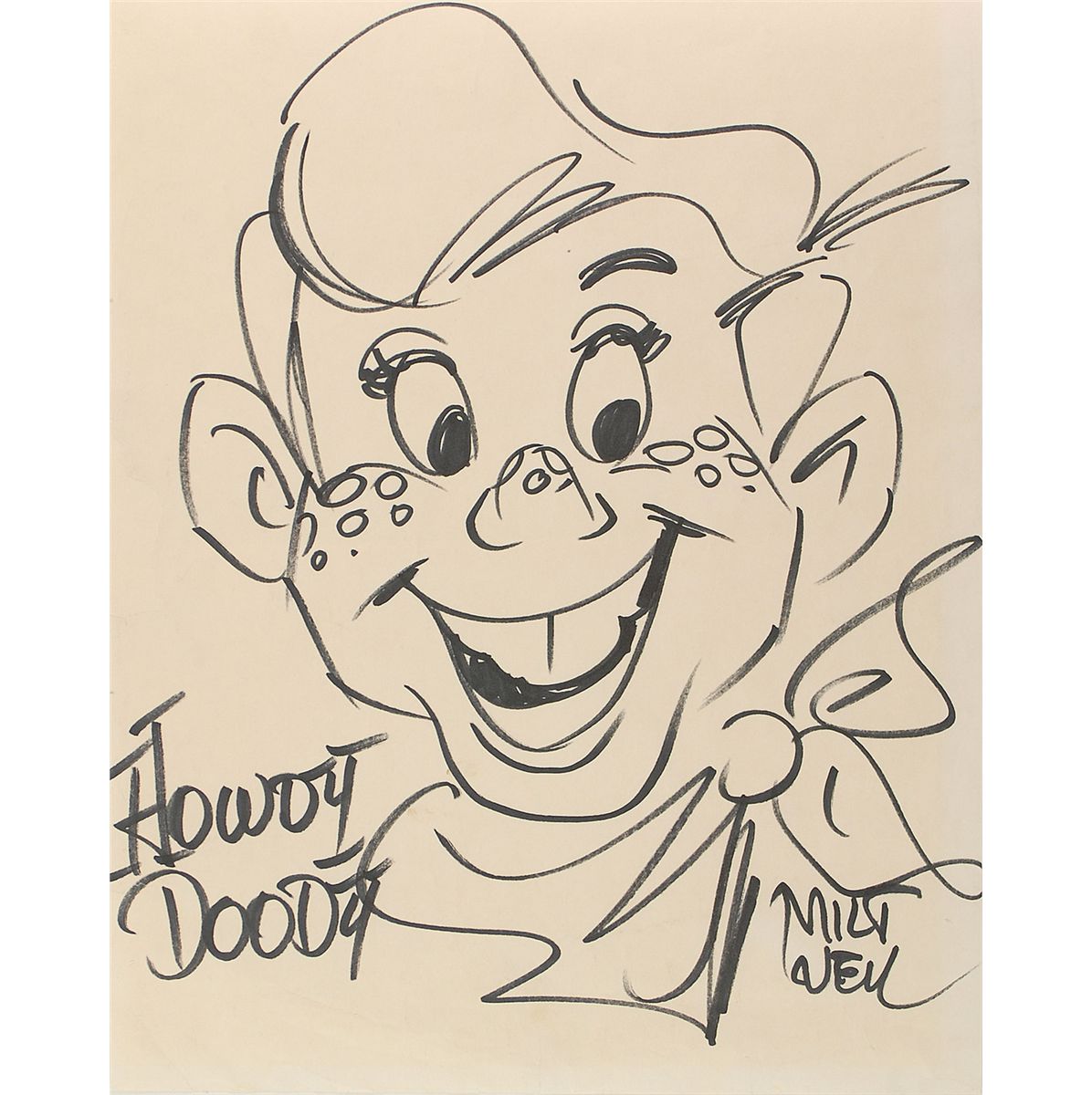 Original signed felt tip sketch of Howdy Doody on an off-white 12 x 15 sheet. In very good condition, with a light central horizontal fold, scattered creases, repaired paper loss to the left border, and faint uniform toning from previous display.