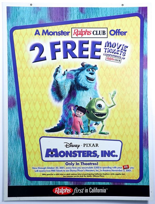 (Disney, c. 2001). A Disney Monsters, Inc. sign displayed for Ralphs stores in California in 2001 to market the release of the film in theaters. The sign displays the characters of Sulley and Boo. The sign is in good condition with normal wear from age and display use. Constructed of thin plastic, almost feels like thin sheet metal. Vinyl graphics on both sides. Measures approximately 55.5"x 42". Item comes with a Grand Circle Tour Auctions COA.