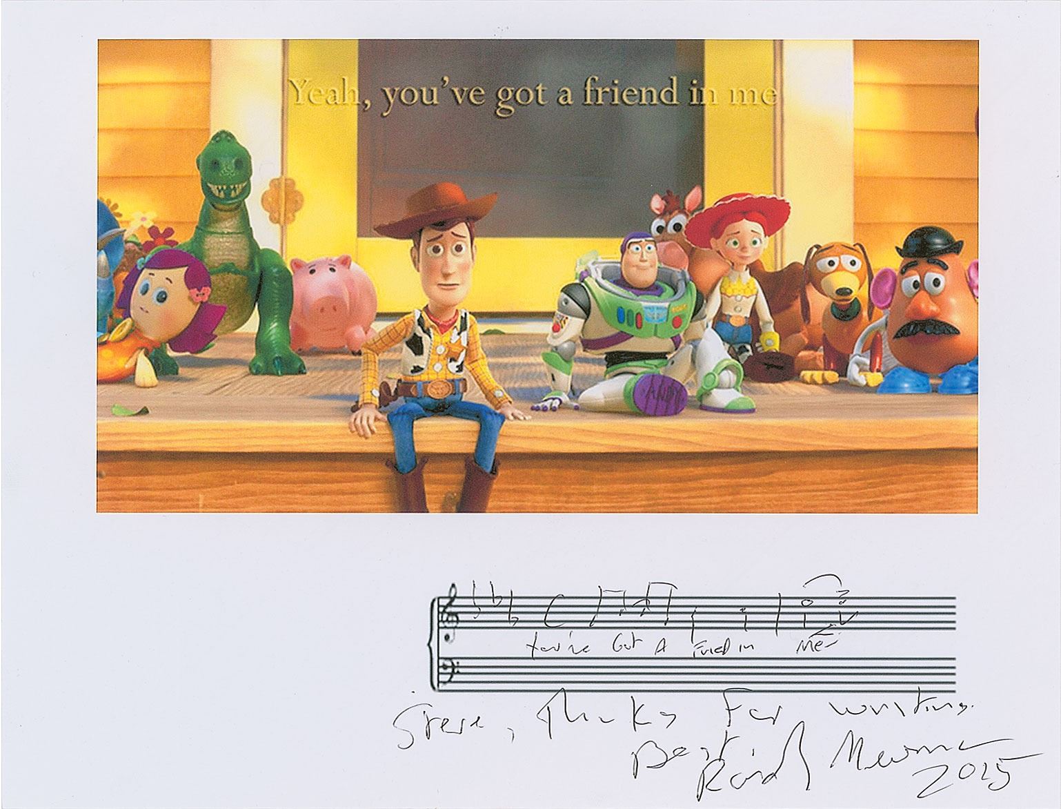 Set of four color laserprint photos, 8.5 x 11 and 11 x 8.5, showing either a famous Disney character or musician, each signed in black ink or ballpoint by a famous Disney songwriter, with three adding inscriptions and all adding a brief AMQS for a famous song, including: Randy Newman ('You've Got a Friend in Me'), Alan Menken ('A Whole New World'), Richard M. Sherman ('It's a Small World'), and Stephen Schwartz ('Colors of the Wind'). In overall very fine condition.