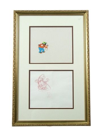 From the award winning Walt Disney Animation Studios, Educational Department, an original hand-painted production cell of the beloved dog of dogs, Goofy, on an original acetate cell, plus a hand-drawn production animation sketch. Both are beautifully double matted and encased in a gold painted frame. (cels are 8"x9" and the frame is approx. (18.25" x 27.25" x 1")