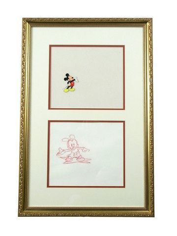 From the award winning Walt Disney Animation Studios, Educational Department, an original hand-painted production cell of the one and only Mickey Mouse in his classic pose, on an original acetate cell, plus a hand-drawn production animation sketch. Both are beautifully framed in a gold frame. (Frame A cell and hand drawn sketch - (cels are 8"x9" and the frame is approx. (18.25" x 27.25" x 1")