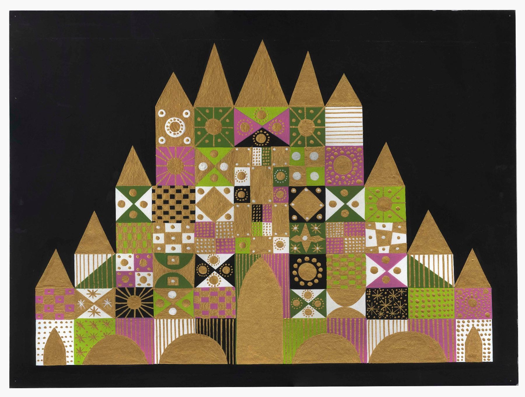 ''It's a Small World'' original concept painting, created in 1964 for Walt Disney by Mary Blair, a ''Disney Legend'' who designed concept art for ''Cinderella'', ''Alice in Wonderland'' and ''Peter Pan''. Originally a pavilion at the 1964 World's Fair, ''It's a Small World'' captured the attention of Walt Disney, who commissioned Mary Blair to adapt it into a ride at Disneyland. Her subsequent artwork is presented here -- a gorgeous 1960s inspired castle-themed piece in colors of pink, green and gold against a contrasting black background. The entrance to the ride is clearly evident in the artwork, referencing Blair's mod-castle aesthetic with soft colors. Board measures 20'' x 15''. Light edge wear and pinholes at corners, otherwise near fine. Beautiful, large concept art for the iconic Disney attraction.