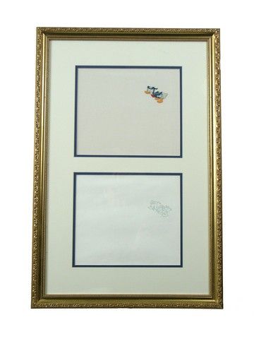 From Walt Disney's Animation Studios Educational Department In Burbank, California, an original hand-painted production cell of Donald Duck. It is on the original acetate animation cell. It also comes with an additional hand-drawn production animation sketch of the matching pose in the cell. Both are beautifully double matted and encased in a gold painted frame. (cels are 8"x9" and the frame is approx. (18.25" x 27.25" x 1"). Comes with a COA.