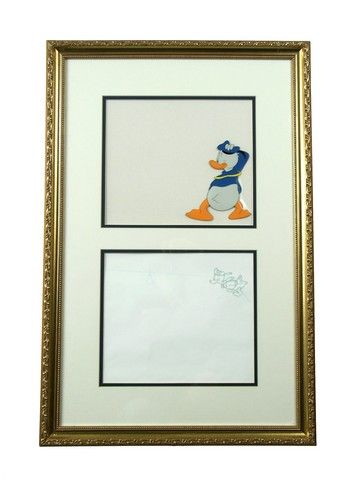 From Walt Disney's Animation Studios Educational Department In Burbank, California, an original hand-painted production cell of Donald Duck. This is an extra large character piece, with Donald in his classic "hand on hat" confused posturing. It is on the original acetate cell. It also comes with an additional hand-drawn production animation sketch. Both are beautifully double matted and encased in a gold painted frame. (cels are 8"x9" and the frame is approx. (18.25" x 27.25" x 1"). Comes with a COA.