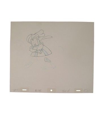 From Walt Disney's Animation Education Division, an original drawing of everyone's favorite dog: Goofy. It is drawn on the reinforced registration keyed paper including the cell number, production number, and the animator's initials. There are also notes for Goofy's wardrobe! Approx. 12.5"x11". Comes with a COA.
