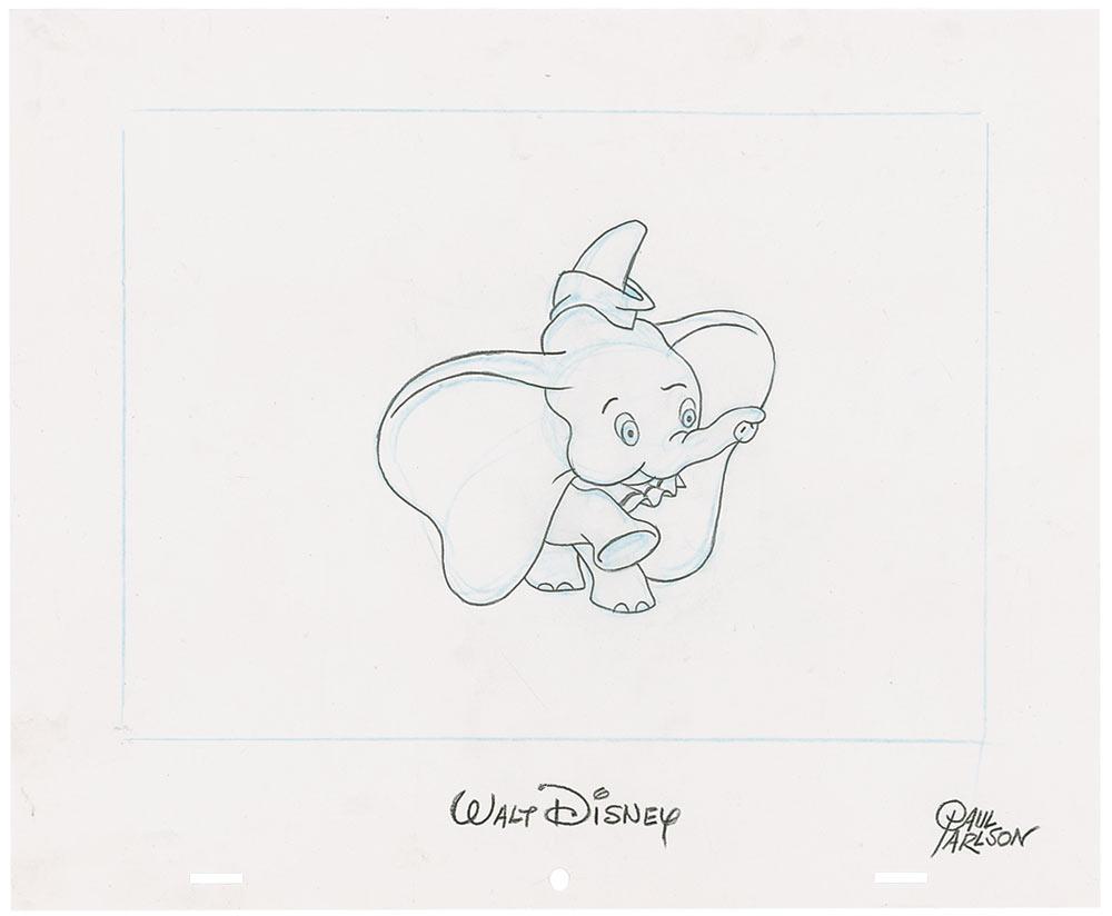 Original souvenir signed pencil sketch of Dumbo on a white 12.75 x 10.5 sheet. Signed in pencil by Paul Carlson with a facsimile signature of Walt Disney. In fine condition, with three binder holes at the bottom of the page and some light wear.
