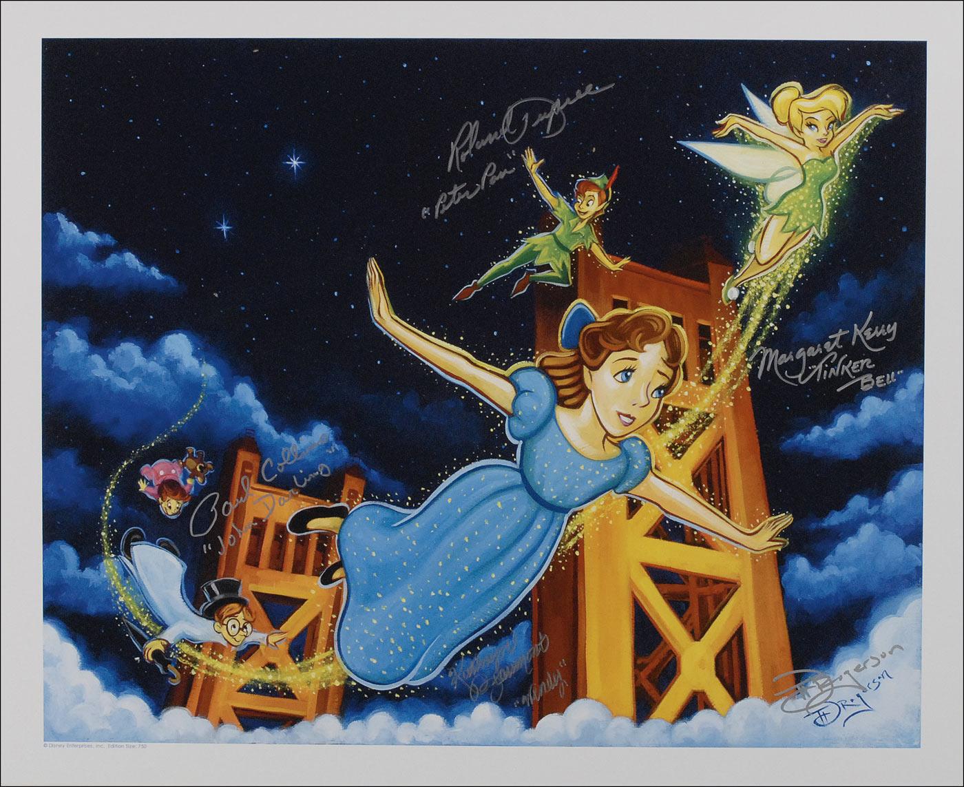 Color limited edition 22 x 18 lithograph entitled ‘Flying Over Sacramento’ depicting Peter Pan, Tinkerbell, Wendy, Michael, and John in flight, signed in silver ink by Kathryn Beaumont (the original Disney voice and reference model for Wendy), Margaret Kerry (original Disney reference and model for Tinkerbell), Roland Dupree (reference model for all the flying and action scenes for Peter Pan), and Paul Collins (the original reference model and voice for John Darling). Also signed in silver ink by the artist, Tim Rogerson. In very fine condition. Quite a scarce combination of signatures from Disney’s animated classic.