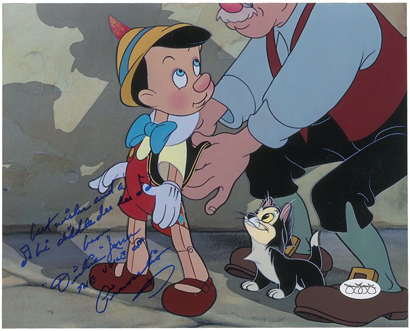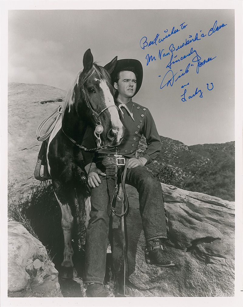 Two signed glossy photos: one color 10 x 8 of Pinocchio and Geppetto, signed in blue felt tip, “Best wishes and a hi diddle dee dee, from Dickie Jones, the voice of Pinocchio;” and one 8 x 10 of Jones as a cowboy, signed and inscribed in blue felt tip, “Best wishes to Mrs. Van Buskirk’s class, sincerely Dickie Jones, and Lucky.” In fine condition, with a JSA authentication label affixed to lower right corner of one photo.