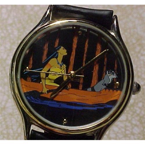 Walt Disney Pocahontas Watch with Meeko in a canoe. The watch is in excellent condition. The protective plastic coating is still covering the back. I doubt if the wach has ever been worn! The silver tone bezel is 1" in diameter. The dial has a silver metalic finish that has a mirror effect. Then tilted at other angles it looks like a black background with the orange vertical stripes that are suppose to look like the bark of the background trees. The padded black genuine leather band including the watch and buckle is 9 1/2" long. <p> The watch comes working excellently with a brand new working quartz battery.