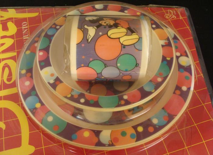 The set includes a 10 inch plate, 7 inch bowl, and 3 1/2 inch tall mug, all in the original packaging. These were made by Stor Line in Brazil, so the text is in Spanish. The blister pack has yellowed, bent, and cracked slightly over the years, but otherwise this set is in mint condition. There is an additional mug outside of the packaging, with slight transfer wear.