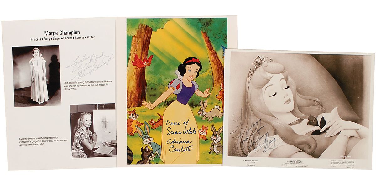 Three glossy photos, two 8 x 10 and one 10 x 8, including one color, each signed in felt tip or ballpoint by the respective actress who portrayed a Disney princess. Signers are: Adriana Caselotti, Mary Costa (ins), and Marge Champion (ins). In fine condition, with light overall crazing to Costa’s photo.