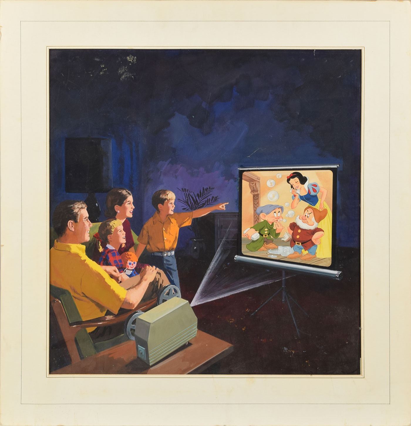 Original hand-painted promotional artwork, 19 x 20, featuring a family watching the Disney classic Snow White and the Seven Dwarfs on a projection screen in their home. Matted to an overall size of 25 x 26. In fine condition. This artwork was presumably produced for some sort of home video advertisement.