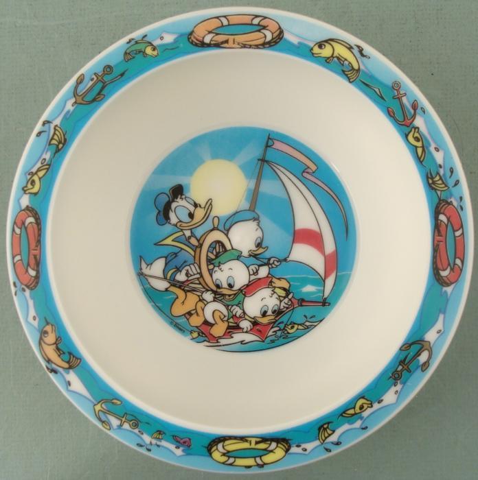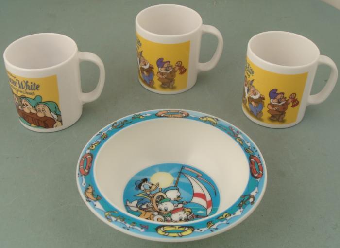There are 3 mugs from Snow White and the Seven Dwarves in 2 different designs, all 3 1/2 inches tall. There is a 7 inch bowl with Donald and nephews sailing. All are plastic, and were made by Stor in Brazil. They are in mint condition.