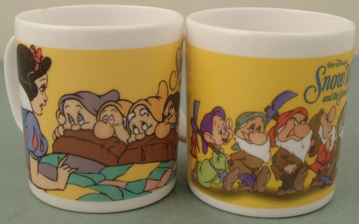 There are 3 mugs from Snow White and the Seven Dwarves in 2 different designs, all 3 1/2 inches tall. There is a 7 inch bowl with Donald and nephews sailing. All are plastic, and were made by Stor in Brazil. They are in mint condition.