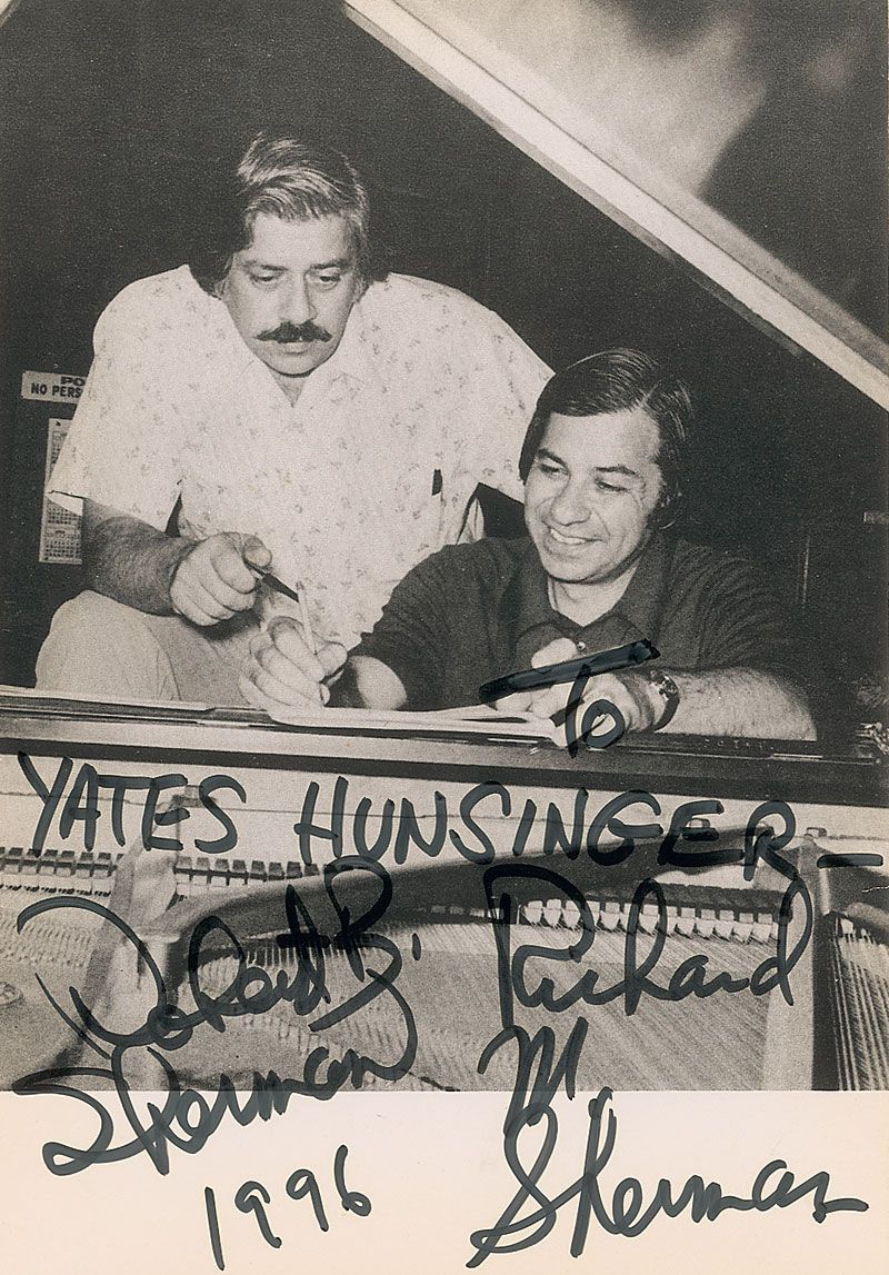 Handsome 4.75 x 7 cardstock photo of the brothers at work behind a piano, signed in black felt tip, “Robert B. Sherman, 1996,” and “Richard M. Sherman,” with one inscribing, “To Yates Hunsinger” above. In fine condition, with a couple of light creases. Accompanied by part of the original mailing envelope.