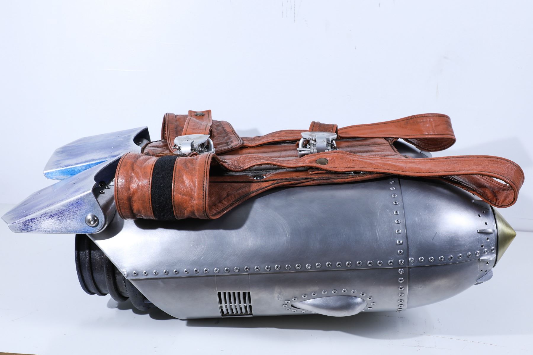 This is a faithful representation of the Cirrus X3 Rocketpack from the 1991 film the Rocketeer. It exceeds the quality of the original and is one of very few made out of metal rather than resin. While the creator of the Rocketeer was illustrator Dave Stevens, the original prop for the film was designed by the director Joe Johnston along with artist Ed Eyth, and built by Michael Possert Jr. This metal version was hand crafted by David J. Guyton at Armor Templates. The sheet metal is 3003 H14 aluminum in both .063 and .050 thicknesses. Various other parts are also 1/8" aluminum plate. All sheet metal parts are hammered and finished by hand. The vents and the nosecones are cast in pewter. The engines are cast resin. This is a gorgeous piece. 1 of only 10 made and includes the coin/plate indicating its design number. Includes a letter of authenticity from the fabricator. Item comes with a Grand Circle Tour Auctions COA.